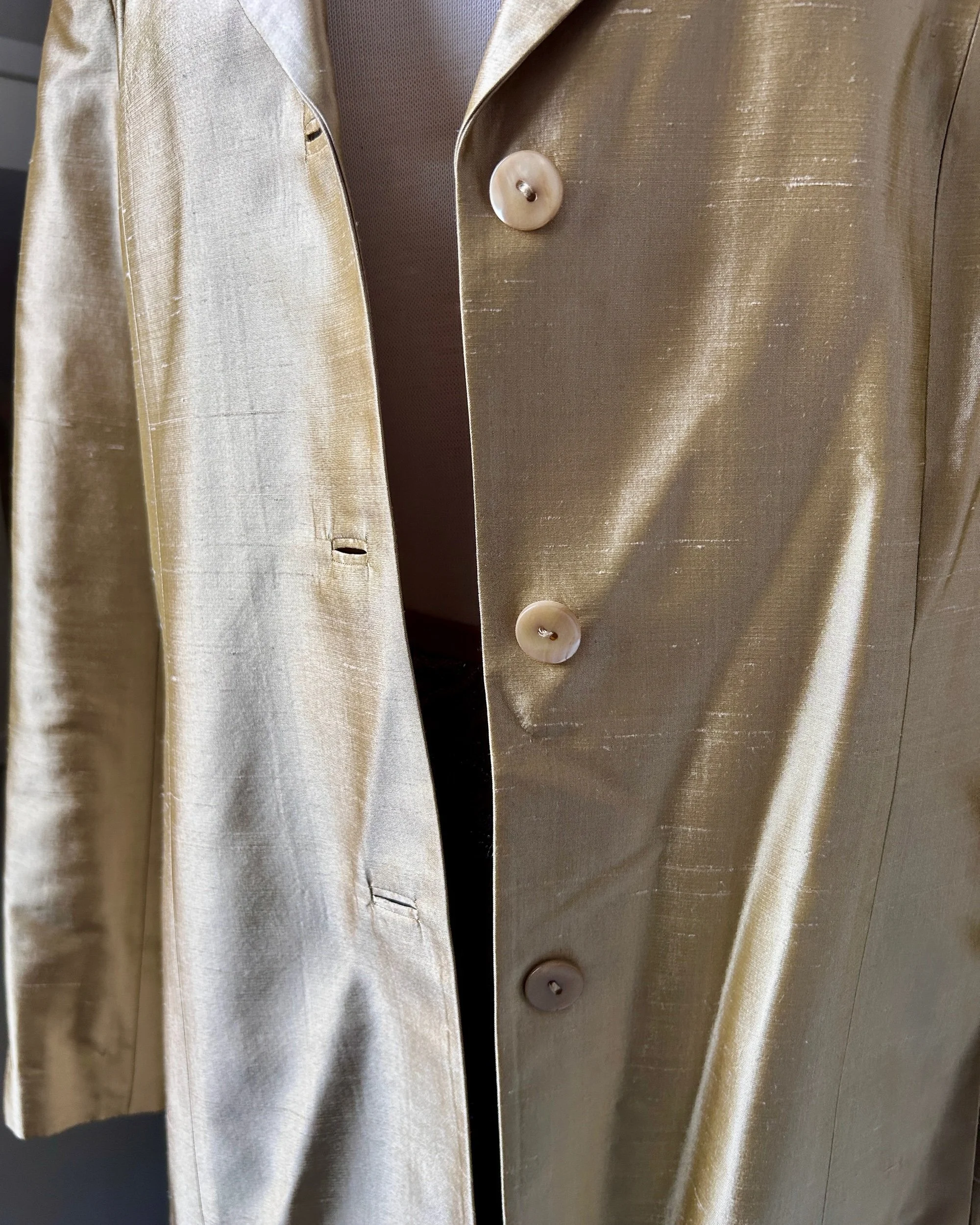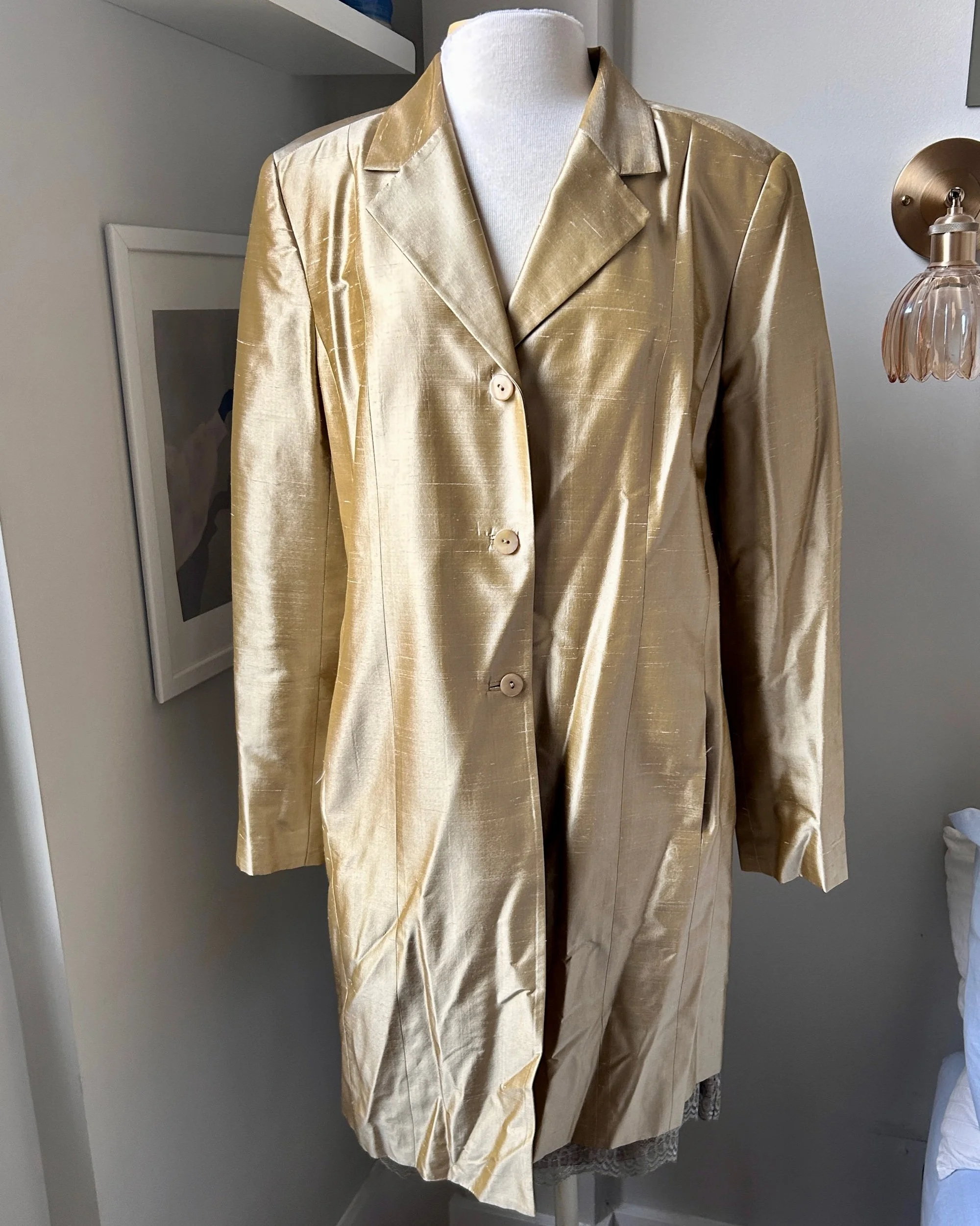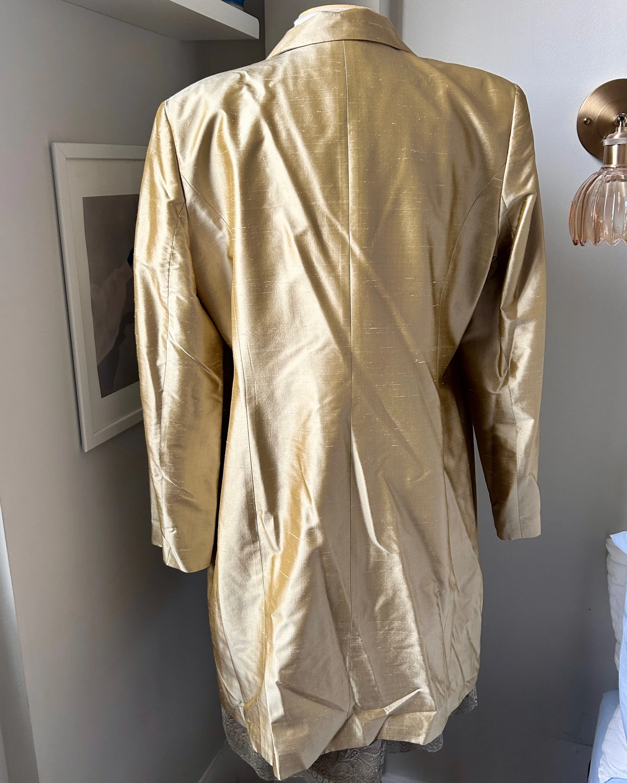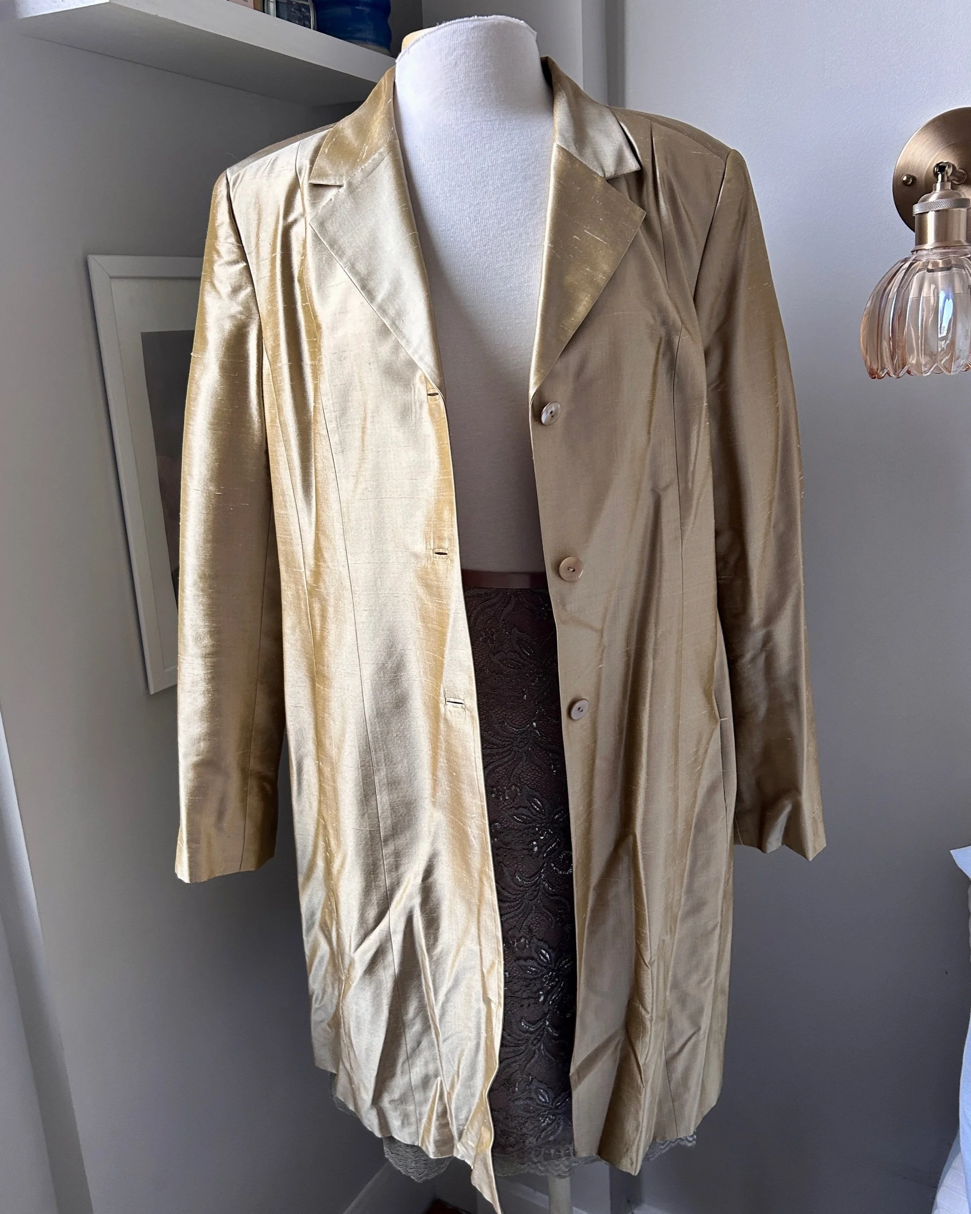 Shop › Gold 100% Silk Jacket Gold 100% Silk Jacket $56.00 No flaws just needs a steam; has pockets and shoulder padsTag size 16; bust 44” sleeve 25” length 36.5” No flaws just needs a steam; has pockets and shoulder padsTag size 16; bust 44” sleeve 25” length 36.5” Add To Cart Added!